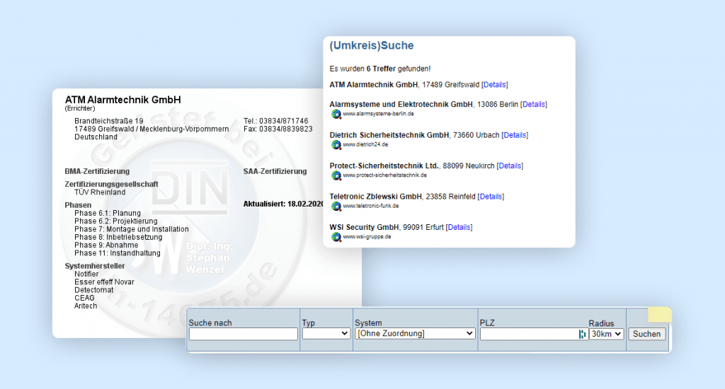 Eine Datenbank mit mehr als 2000 Unternehmen, die nach DIN 14675 zertifiziert sind.