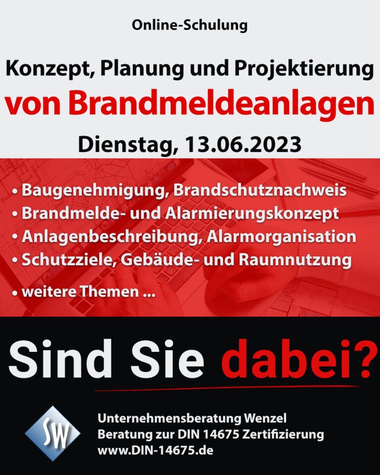 Dieses Seminar eignet sich für Fachplaner und Facherrichter, die ihr Fachwissen über Brandmeldekonzepte und Planung von BMA vertiefen oder auffrischen möchten. Planer und Errichter erhalten in diesem Seminar alle wichtigen Informationen, die sie zum Erstellen eines Brandmelde- und Alarmierungskonzeptes und einer kompetenten Planung benötigen.