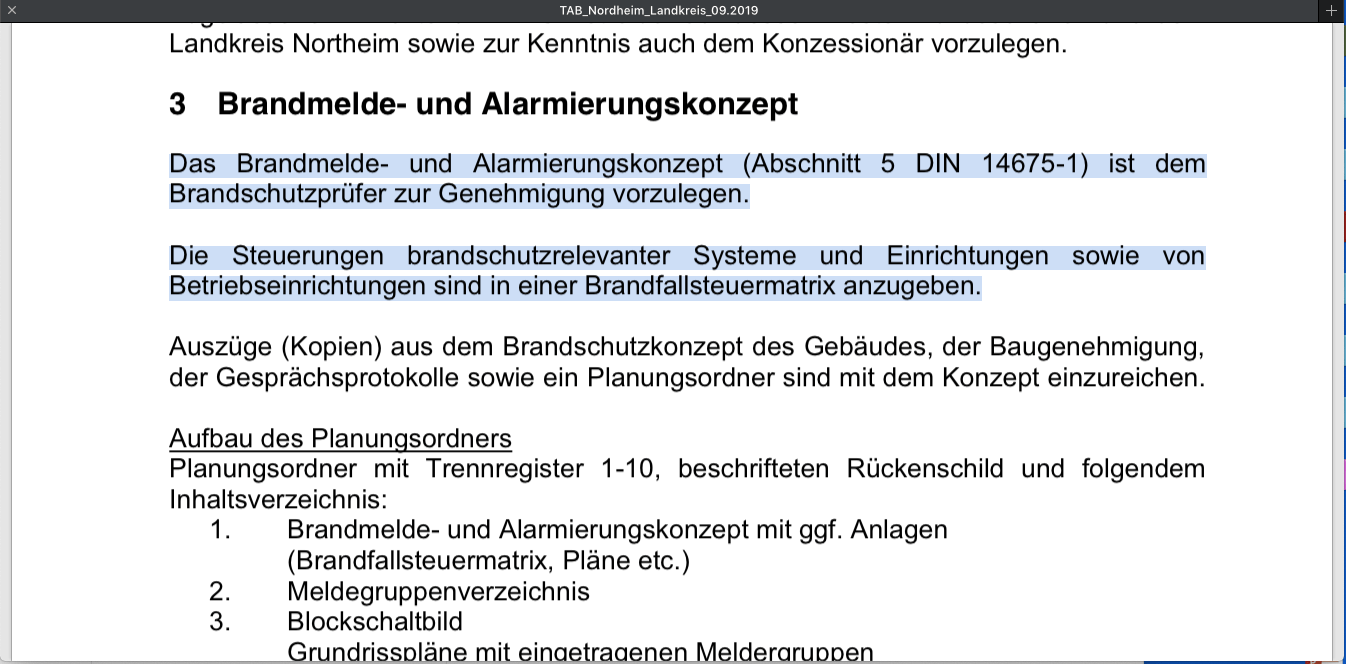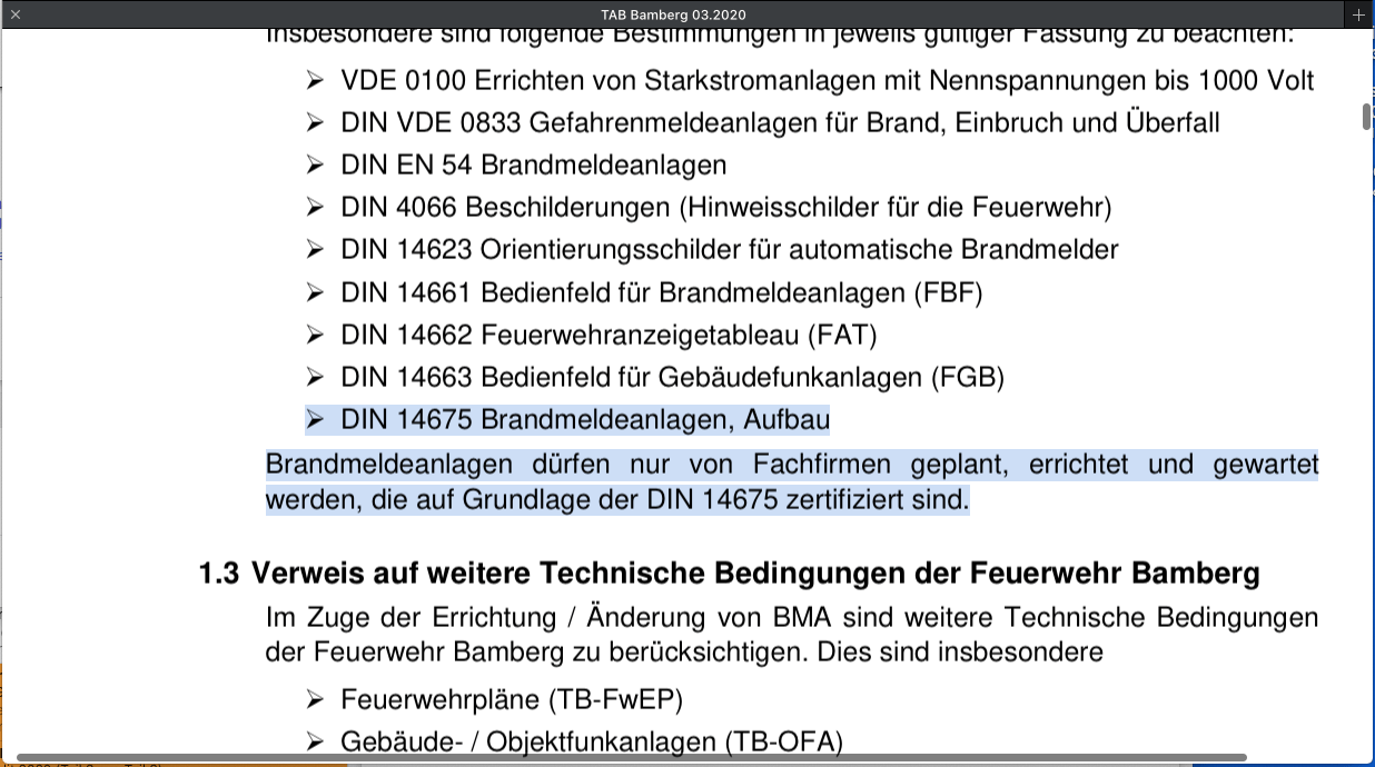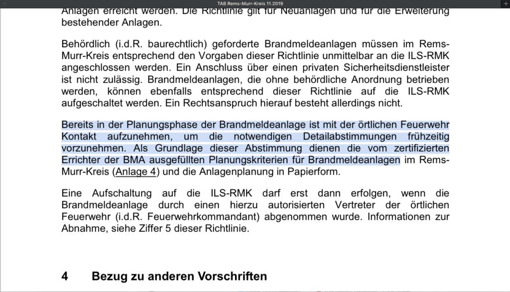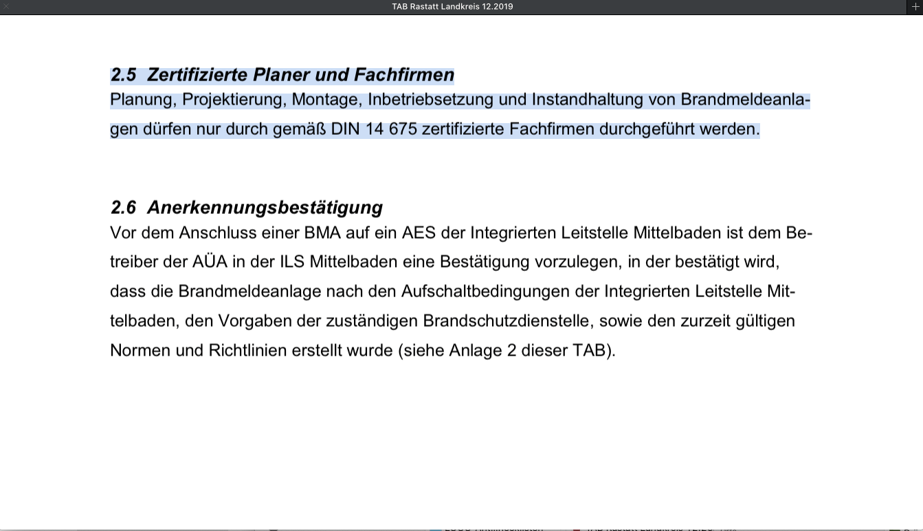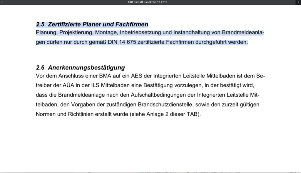 Die fachlichen Vorgaben sind in den Phasen der DIN 14675 festgelegt. Die technischen Anschlussbedingungen der Feuerwehr (TAB) sind von Stadt zu Stadt lokal und relativ individuell aufgestellt. Viele TAB’s erfuhren nach 2003 eine Änderung. Was wurde geändert? Natürlich wurde eine technische Aktualisierung vorgenommen. Und die Forderung zur Einhaltung der DIN 14 675 wurde integriert. In vielen TAB’s ist dies auch unmissverständlich hineingeschrieben worden: Eine Zertifizierung nach DIN 14675 wird verlangt.