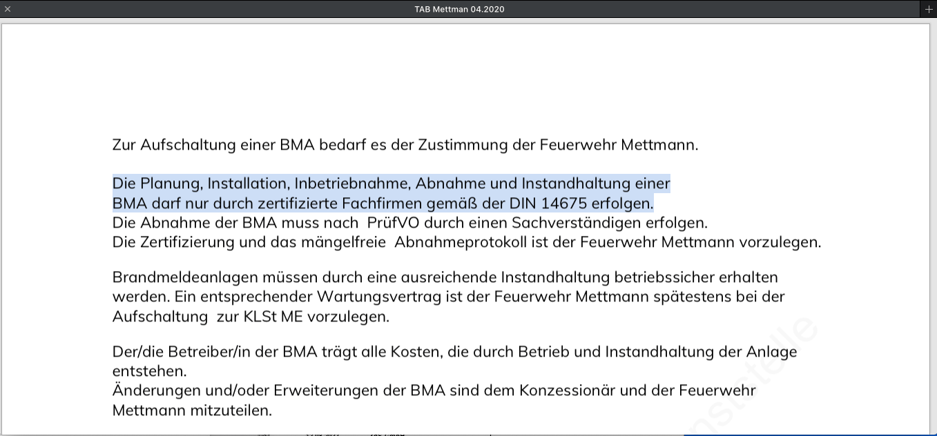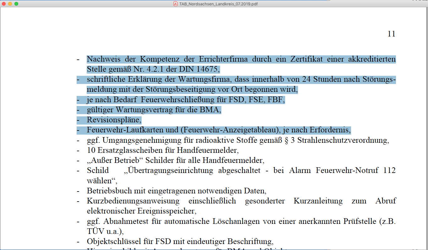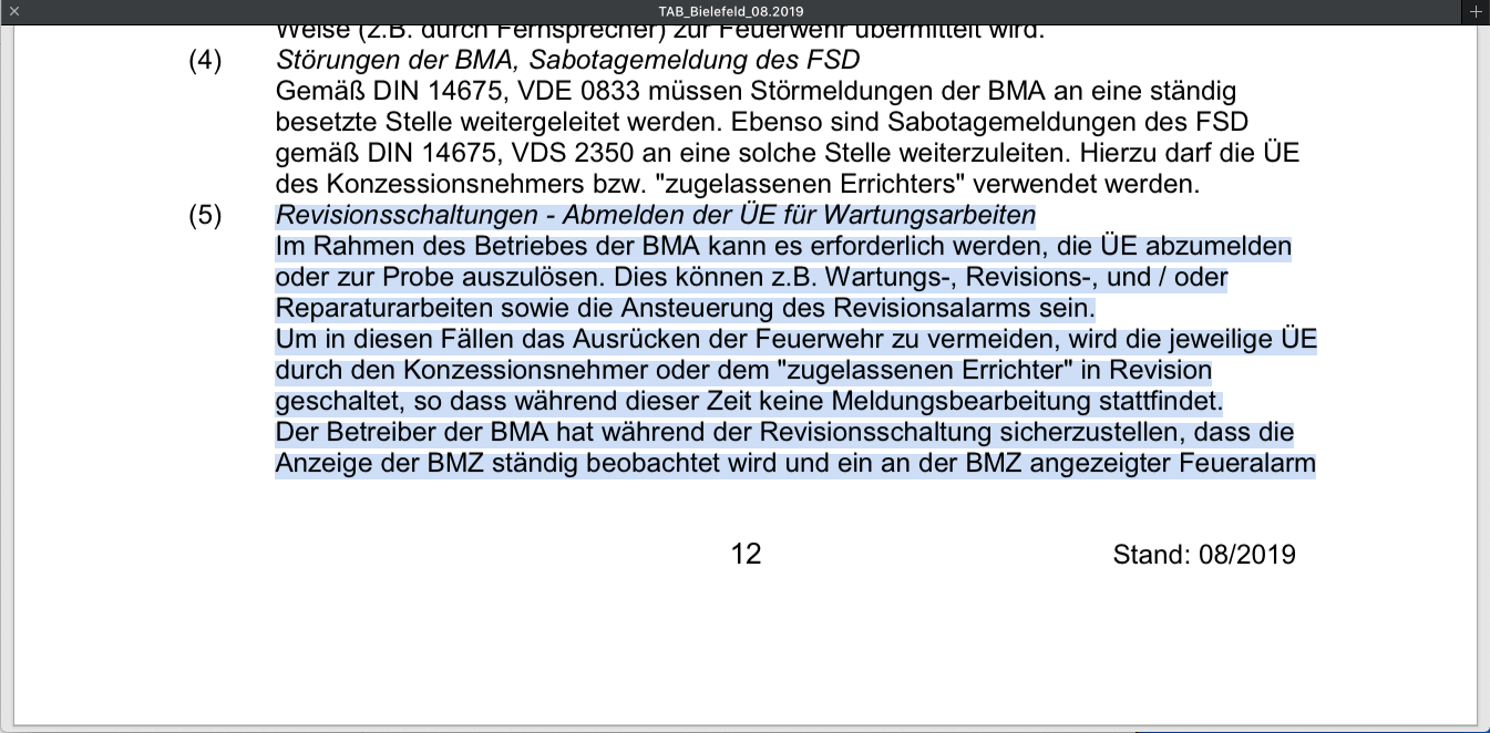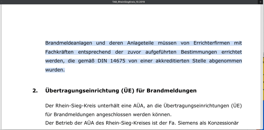Die fachlichen Vorgaben sind in den Phasen der DIN 14675 festgelegt. Die technischen Anschlussbedingungen der Feuerwehr (TAB) sind von Stadt zu Stadt lokal und relativ individuell aufgestellt. Viele TAB’s erfuhren nach 2003 eine Änderung. Was wurde geändert? Natürlich wurde eine technische Aktualisierung vorgenommen. Und die Forderung zur Einhaltung der DIN 14 675 wurde integriert. In vielen TAB’s ist dies auch unmissverständlich hineingeschrieben worden: Eine Zertifizierung nach DIN 14675 wird verlangt.